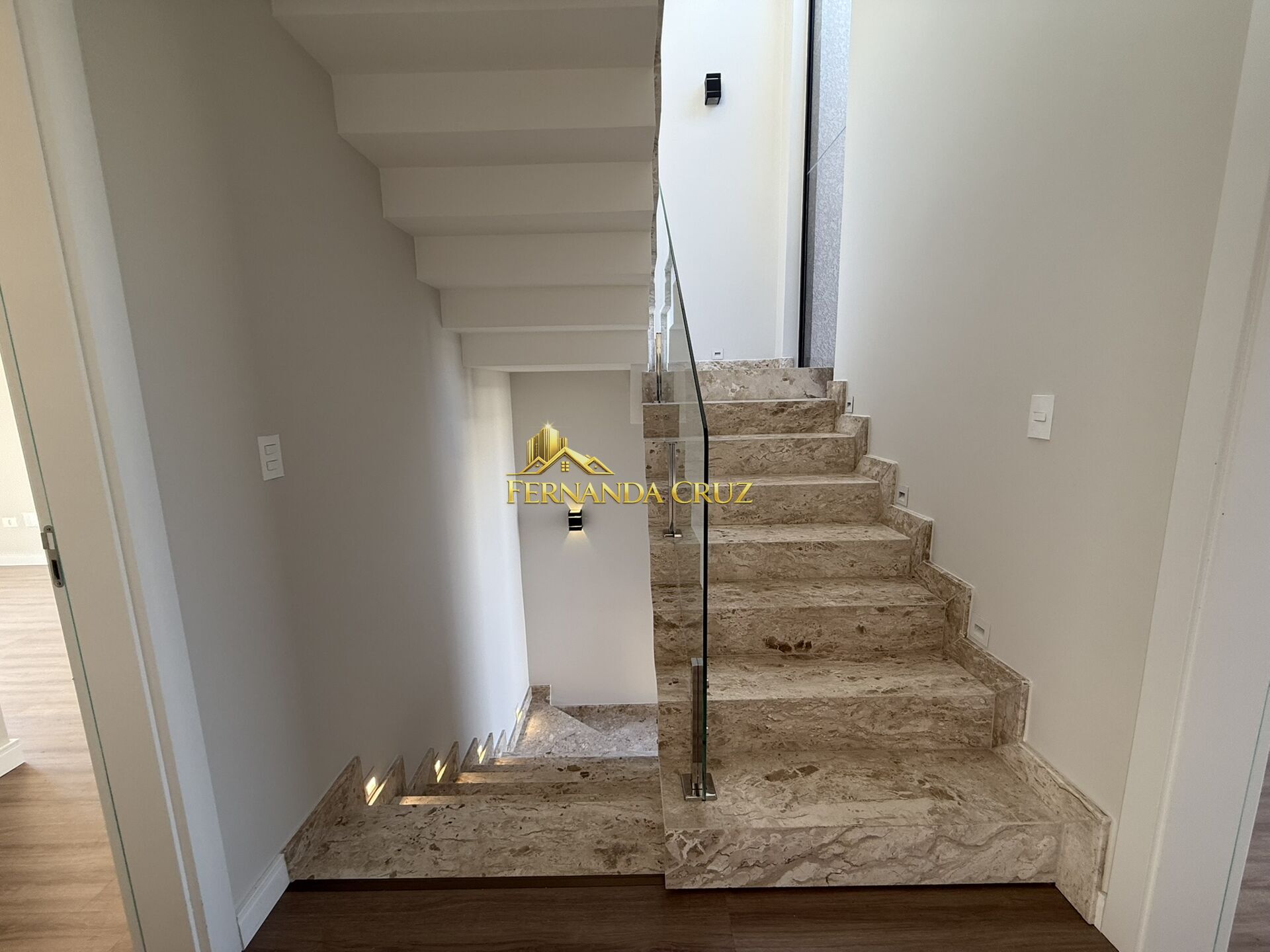 Escada em mármore com guarda-corpo em vidro